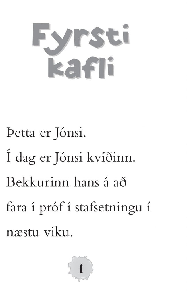 Jónsi er hlédrægur strákur sem þarf að takast á við alls konar áskoranir, stundum með hjálp besta vinar síns, hennar Binnu B. Í þessari bók á Jónsi að fara í próf en frestar því að æfa sig, honum finnst nefnilega stafsetning leiðinleg. Hvað gerist ef hann frestar því of lengi?